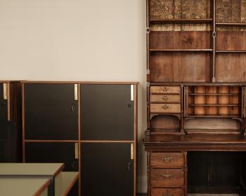 Our materials and feature elements were affected by its imposing beams, a monumental sliding door that carves up the space and a floor inlaid with metal cart tracks. Reflecting these raw aesthetics, we chose to make refined industrial sofas and armchairs upholstered with muted Bute fabric and steel cube stools.