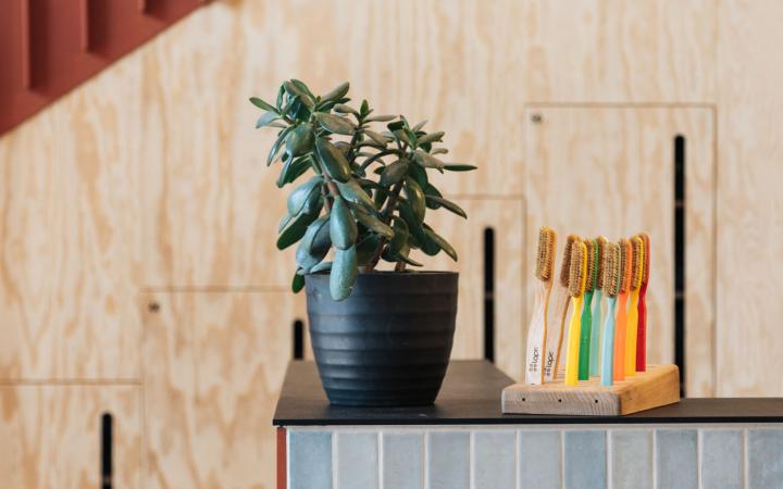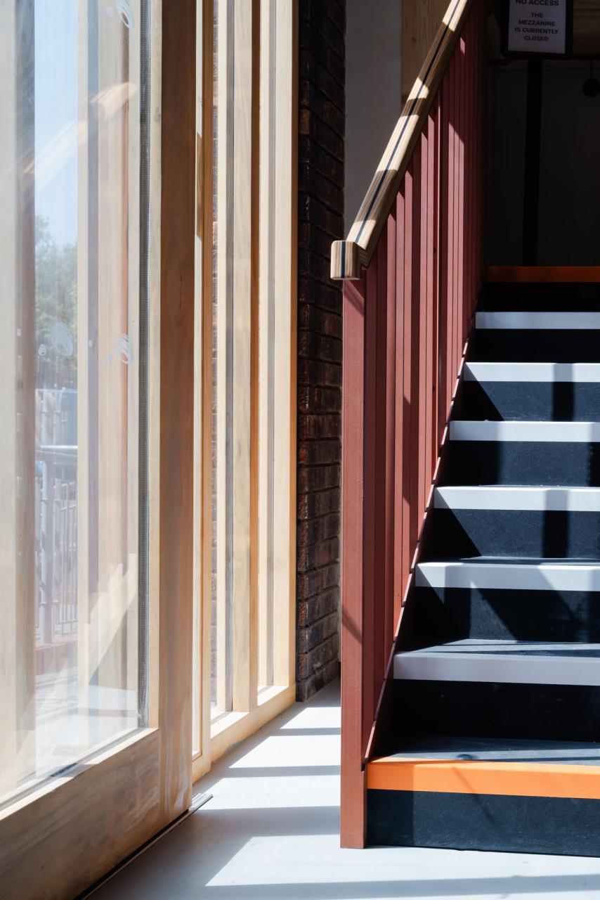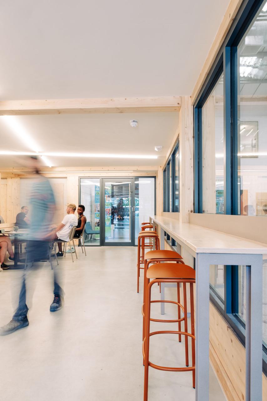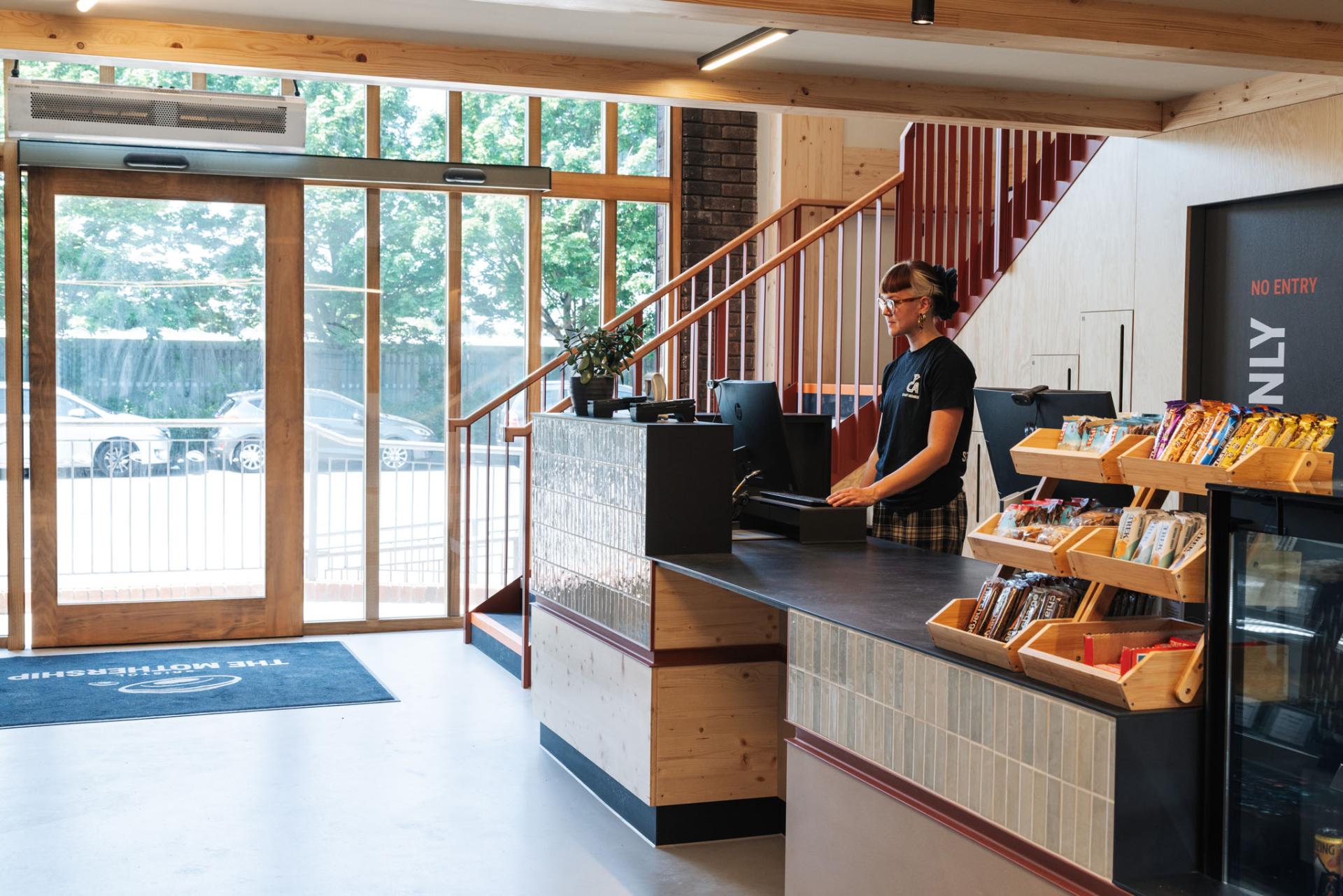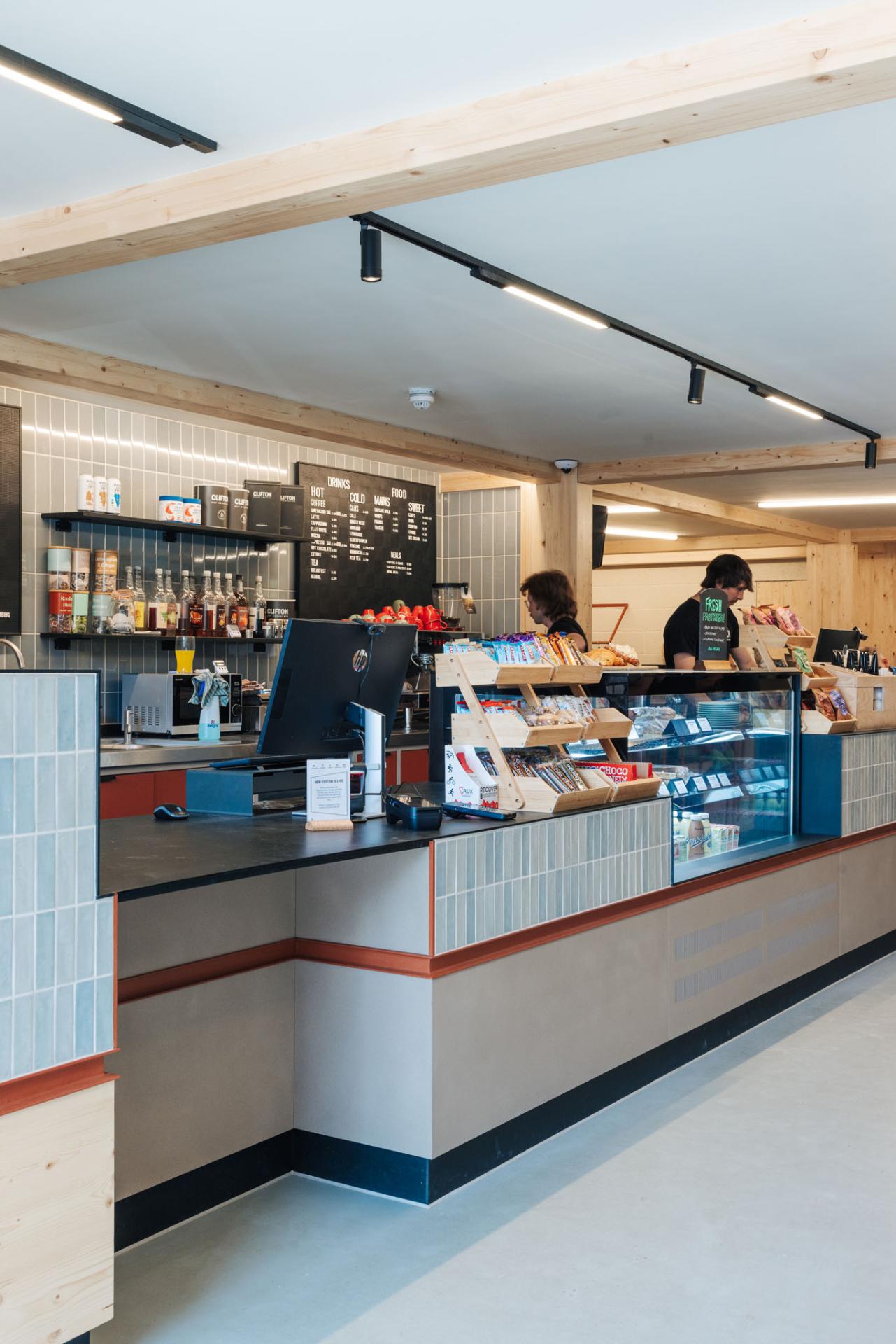 The materials used throughout the project were chosen for their texture, tone, and practicality. Textured powder-coated finishes, blue tiles, and a mix of natural wood surfaces bring warmth and contrast to the space. These simple, durable finishes add depth without feeling over-designed — helping the new areas at TCA Mothership feel both functional and inviting.