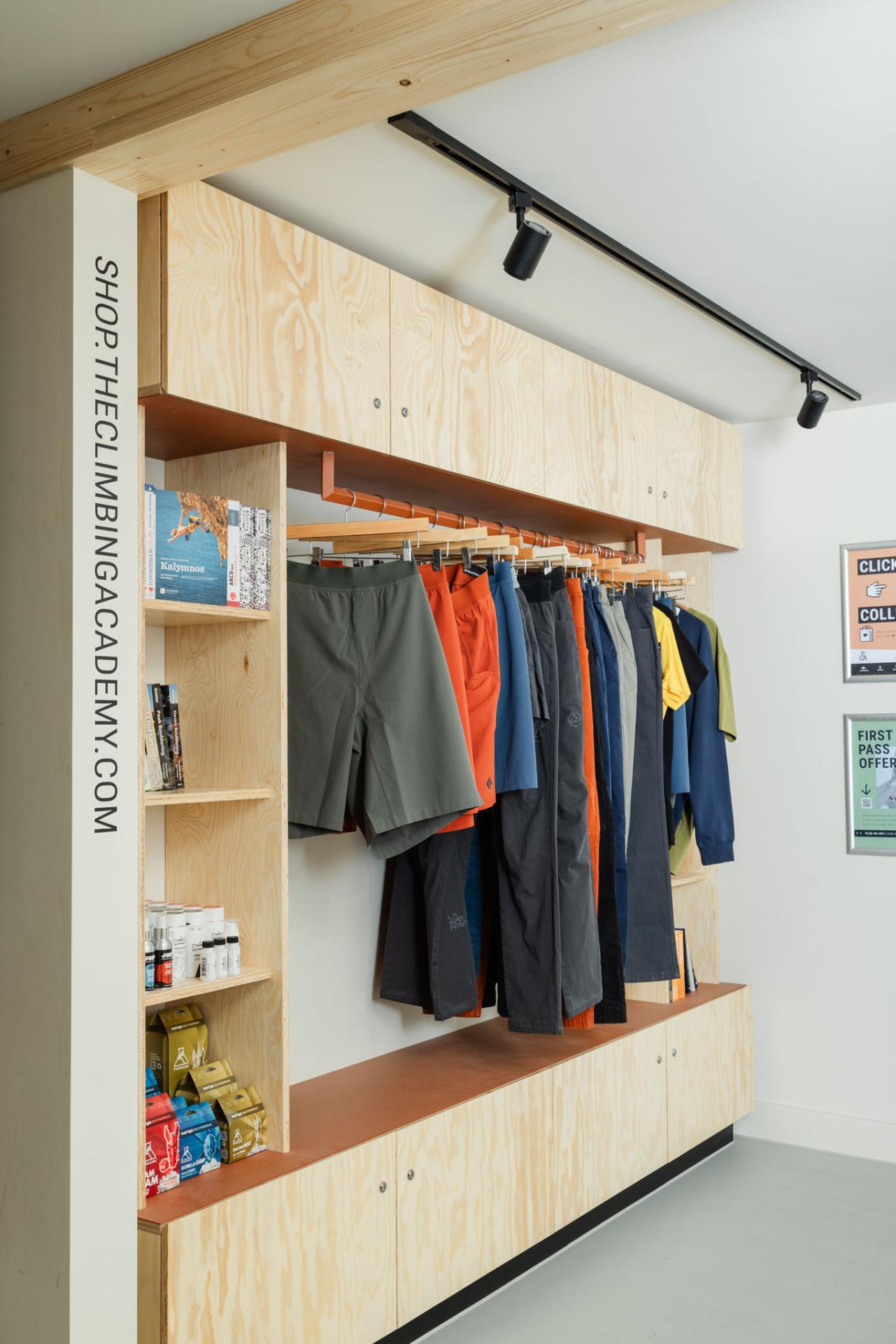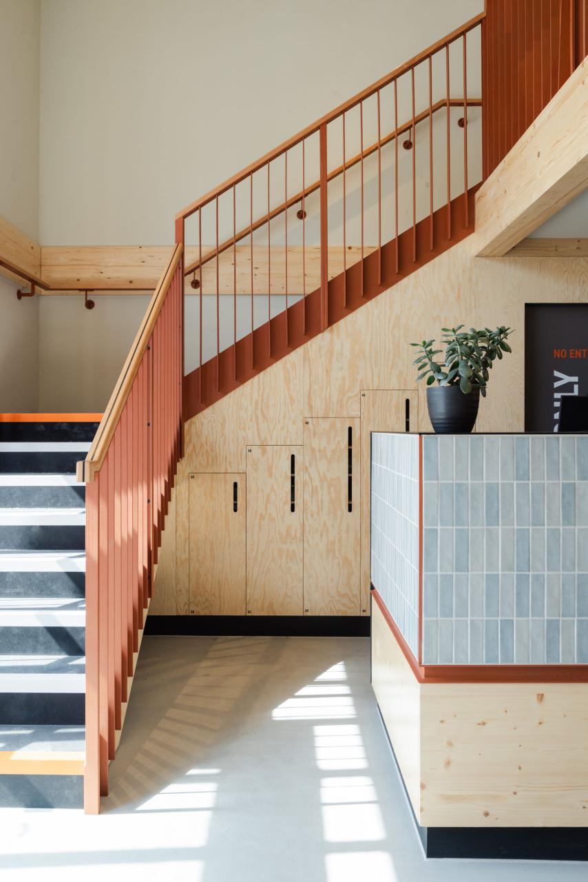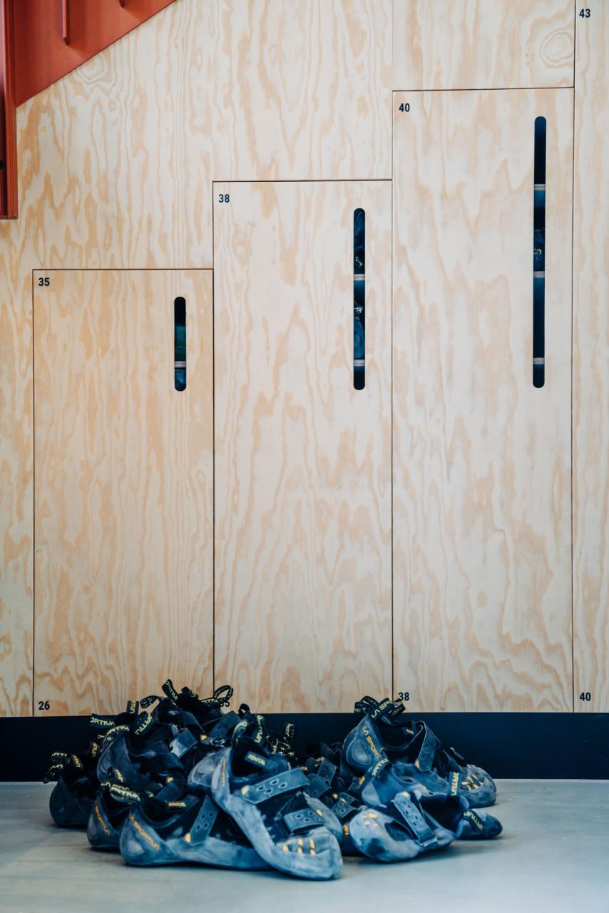 The new staircase at TCA Mothership blends clean design with function. Connecting the ground floor to the new first floor, it features integrated storage for climbing shoes, keeping the space organized and uncluttered. Simple yet purposeful, this design enhances the flow of the centre while offering a practical solution for climbers.